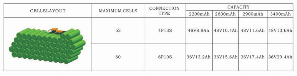 52PCS 18650 Cylinder cells, capacity 36V10Ah-17Ah or 48V8AH-13.6AH